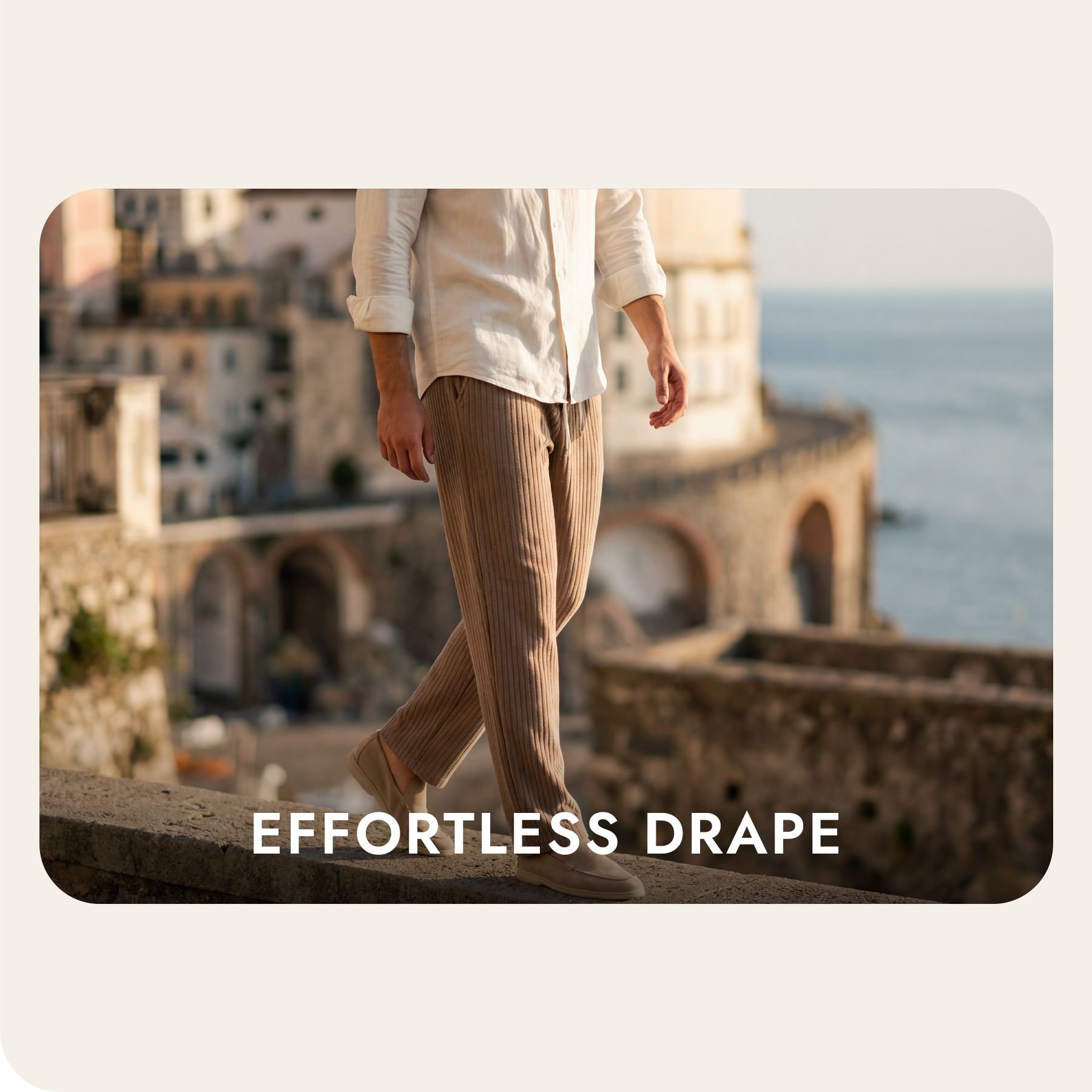 The Rome Trousers are cut for easy sophistication: a soft rib-knit texture, a straight-leg silhouette, and an elasticated waistband with a contrast flat drawcord that keeps the look clean while staying effortless. The vertical rib subtly elongates the leg (like corduroy’s lines, but lighter), giving you lounge-level comfort that still reads polished.